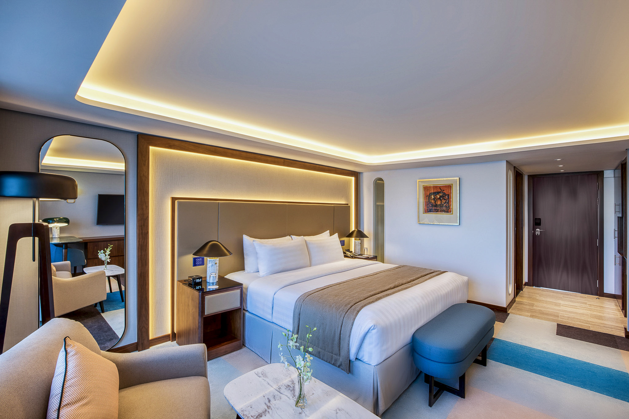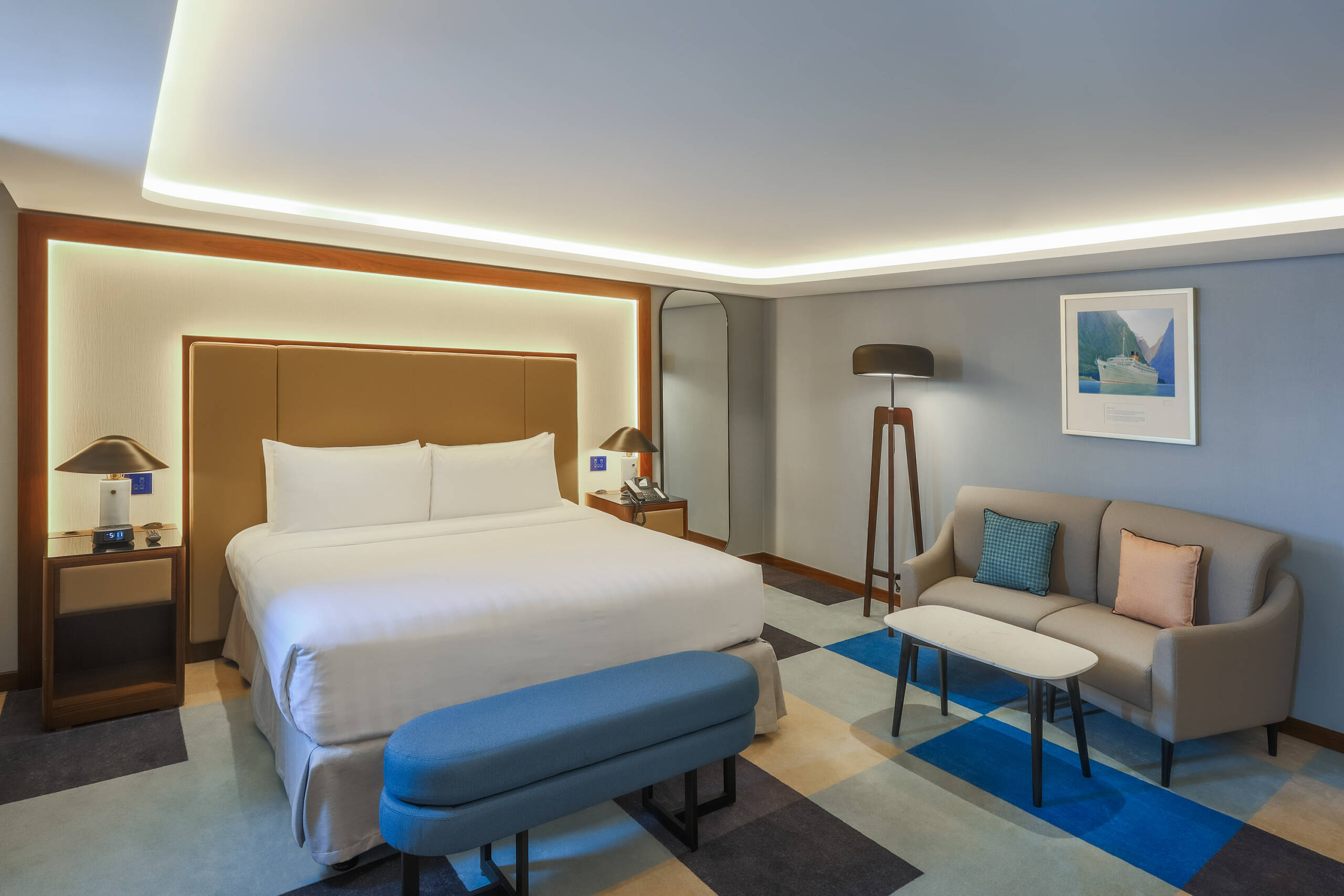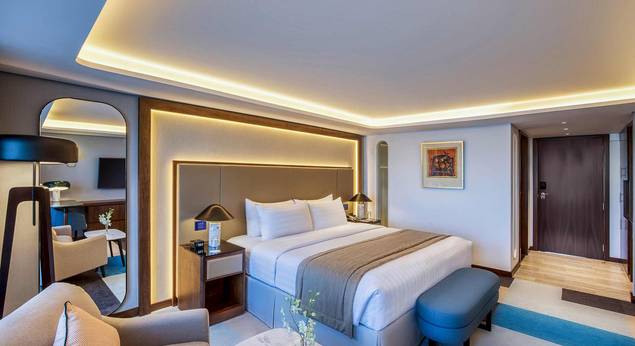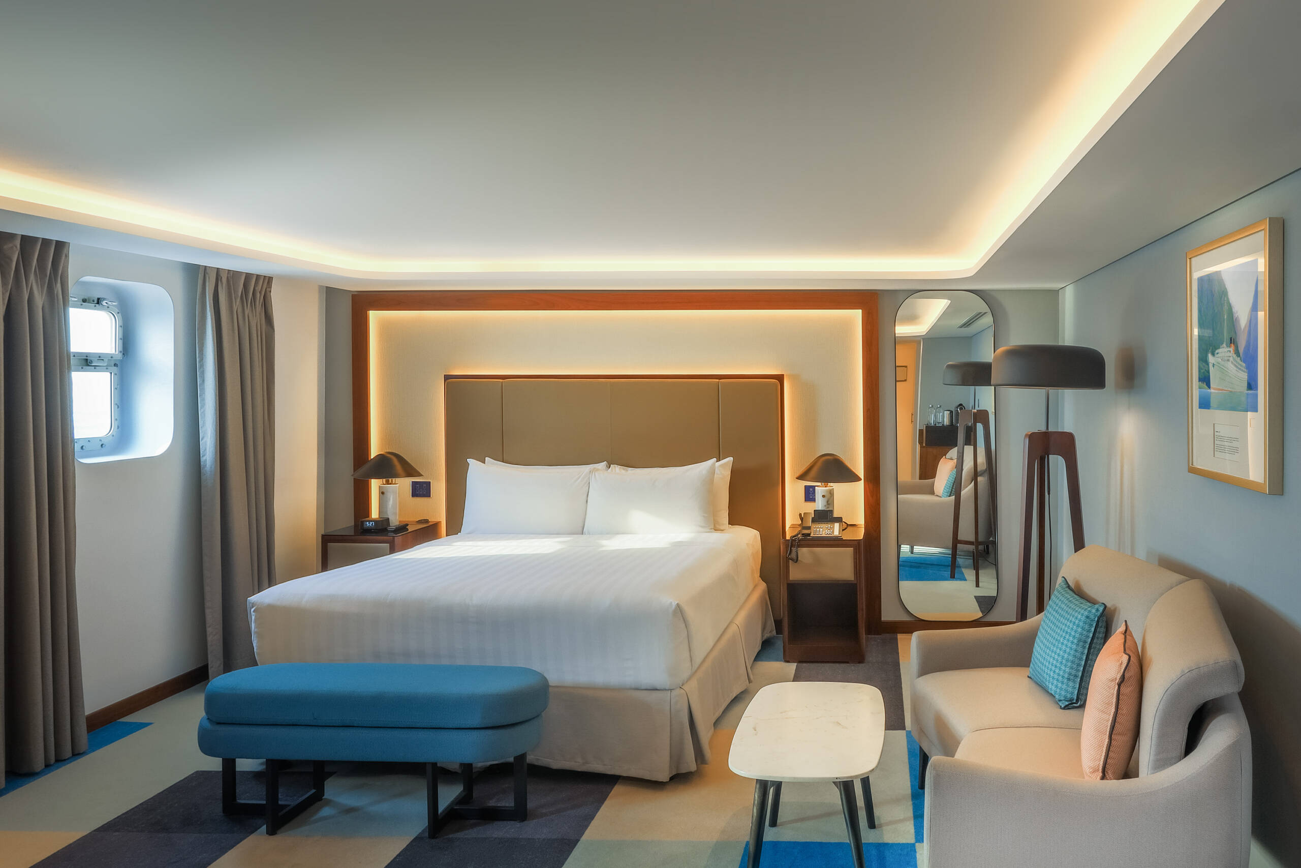 تتميّز الغرف بمزيج متناغم من الألوان المحايدة الناعمة تزيّنها لمسات باللون الأزرق البحري، في تناسق يحاكي مشهد لقاء المحيط بخط الأفق. تتميّز هذه الغرف بتصاميم تُراعى فيها أدق التفاصيل، لتقدم لكم تجربة تتخطى حدود الراحة الاعتيادية إلى عالم من المغامرات البحرية العظيمة.