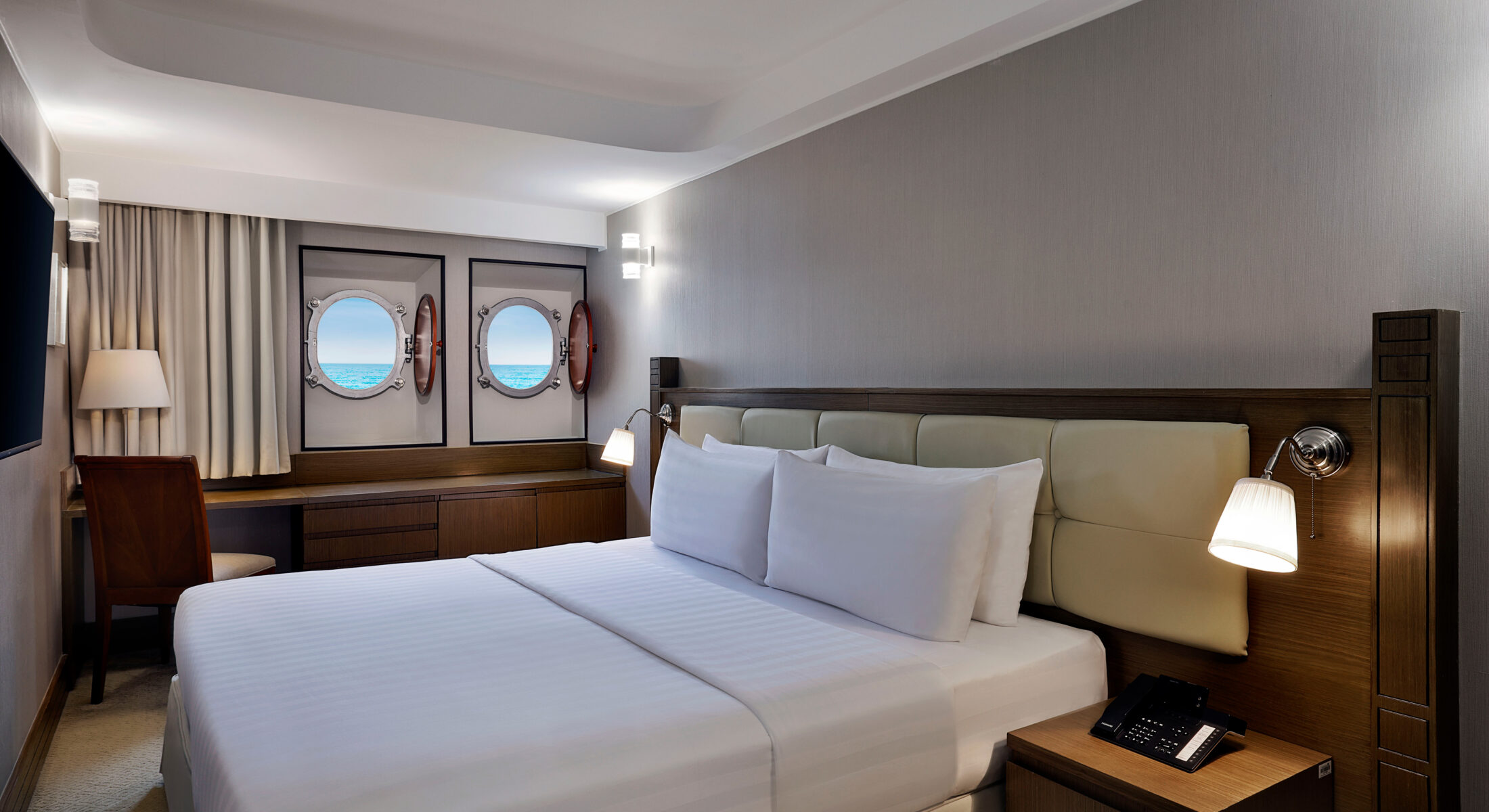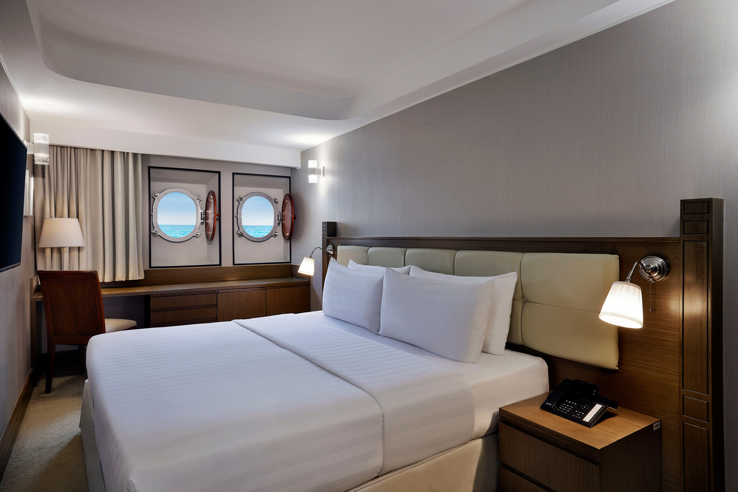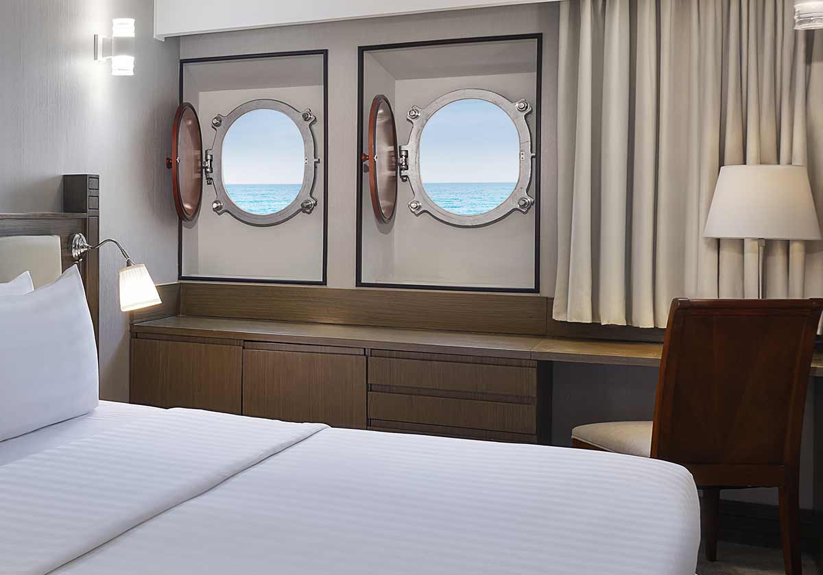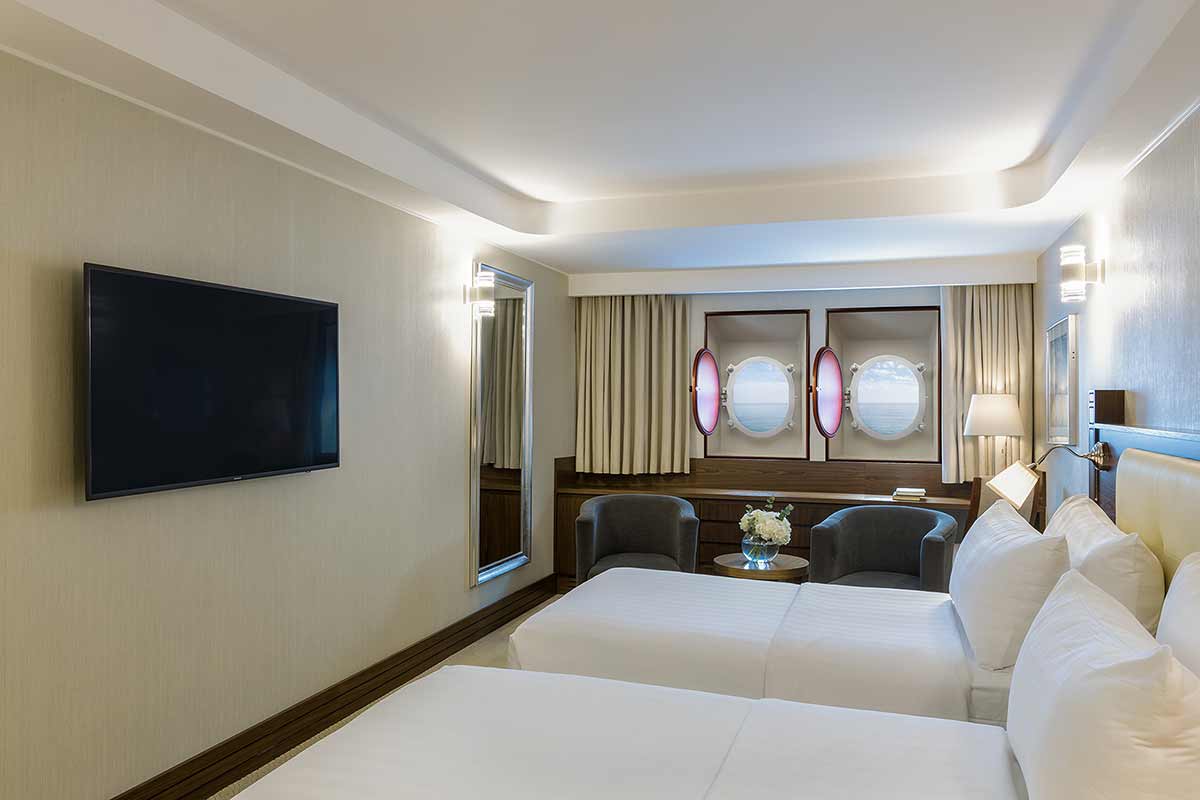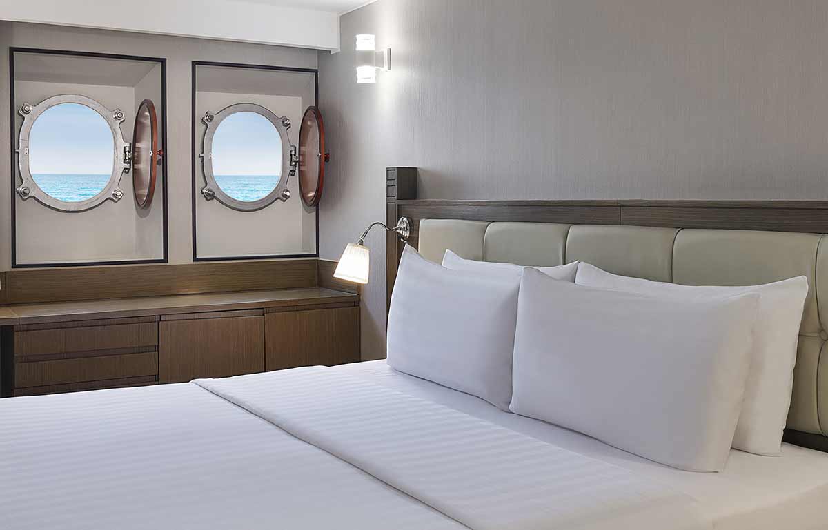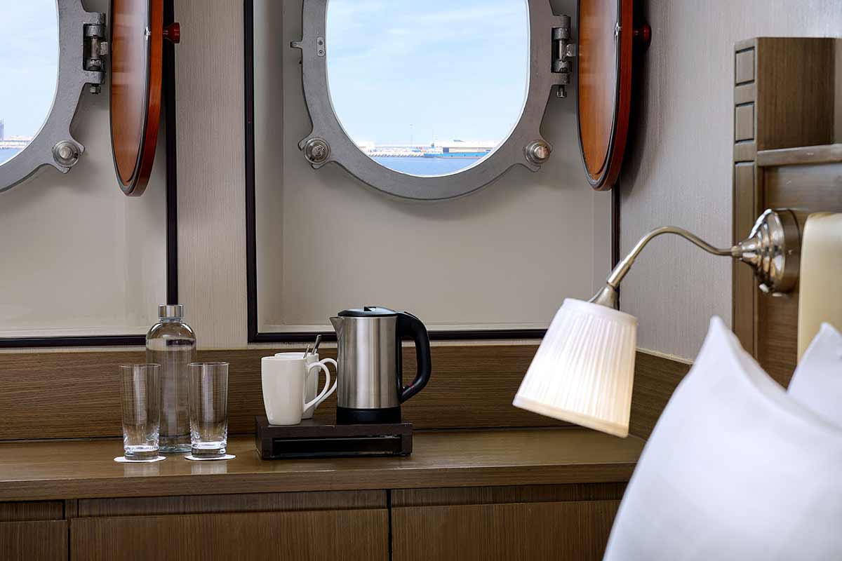 أمّا تصميمها فيُراعي تطلعات ضيوفنا الباحثين عن تجربة بحرية أصيلة، فتتزيّن جدرانها بنوافذ دائرية تفتح أمامكم نافذة ساحرة على أفق دبي المتألق.