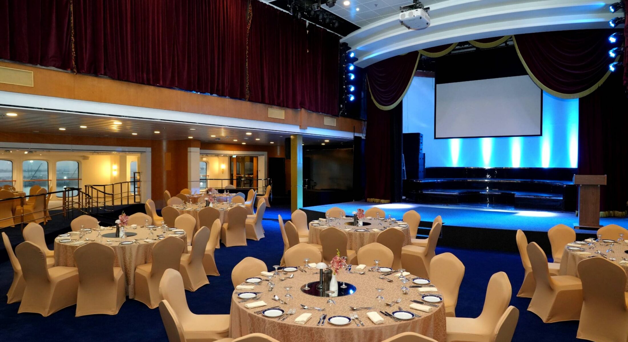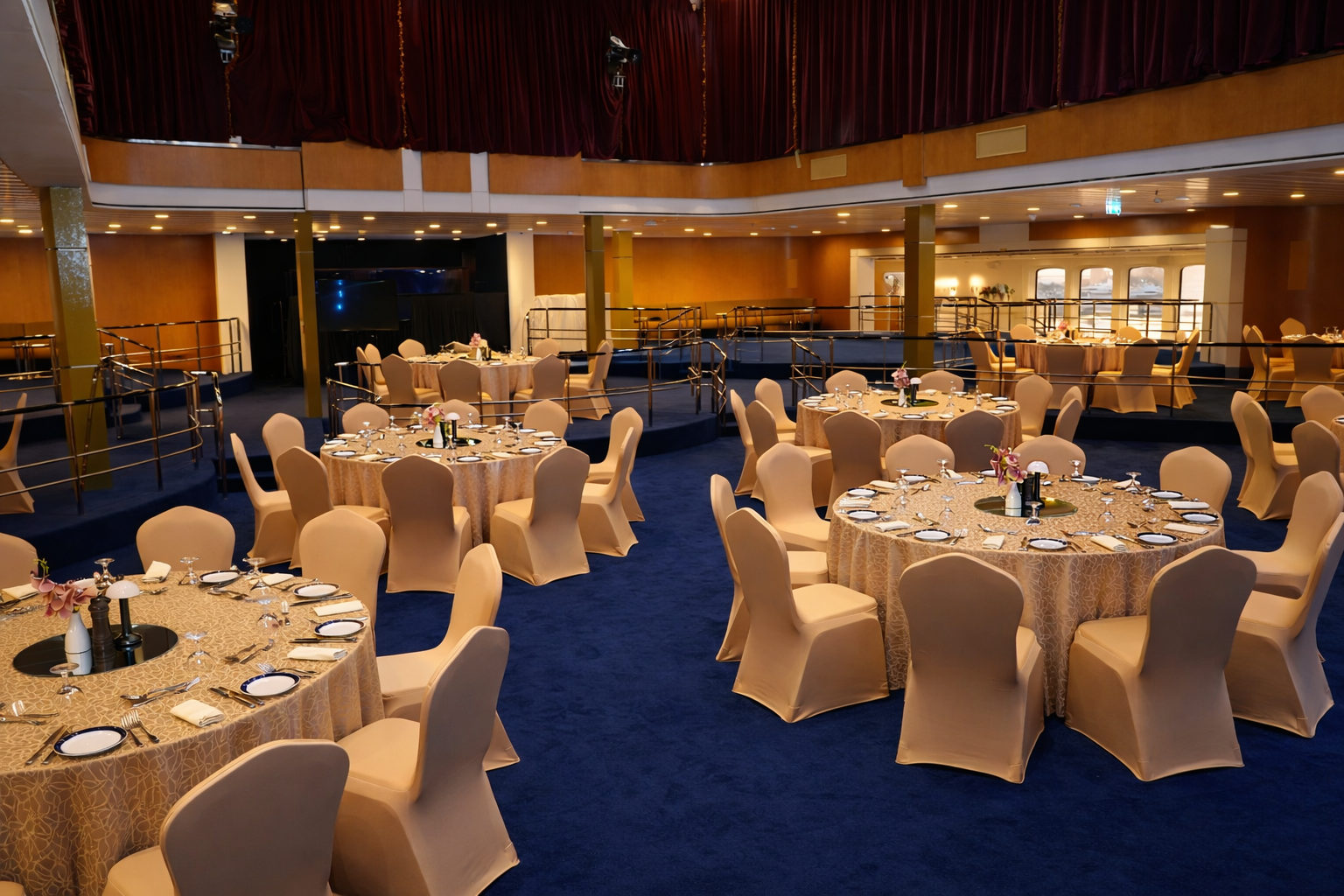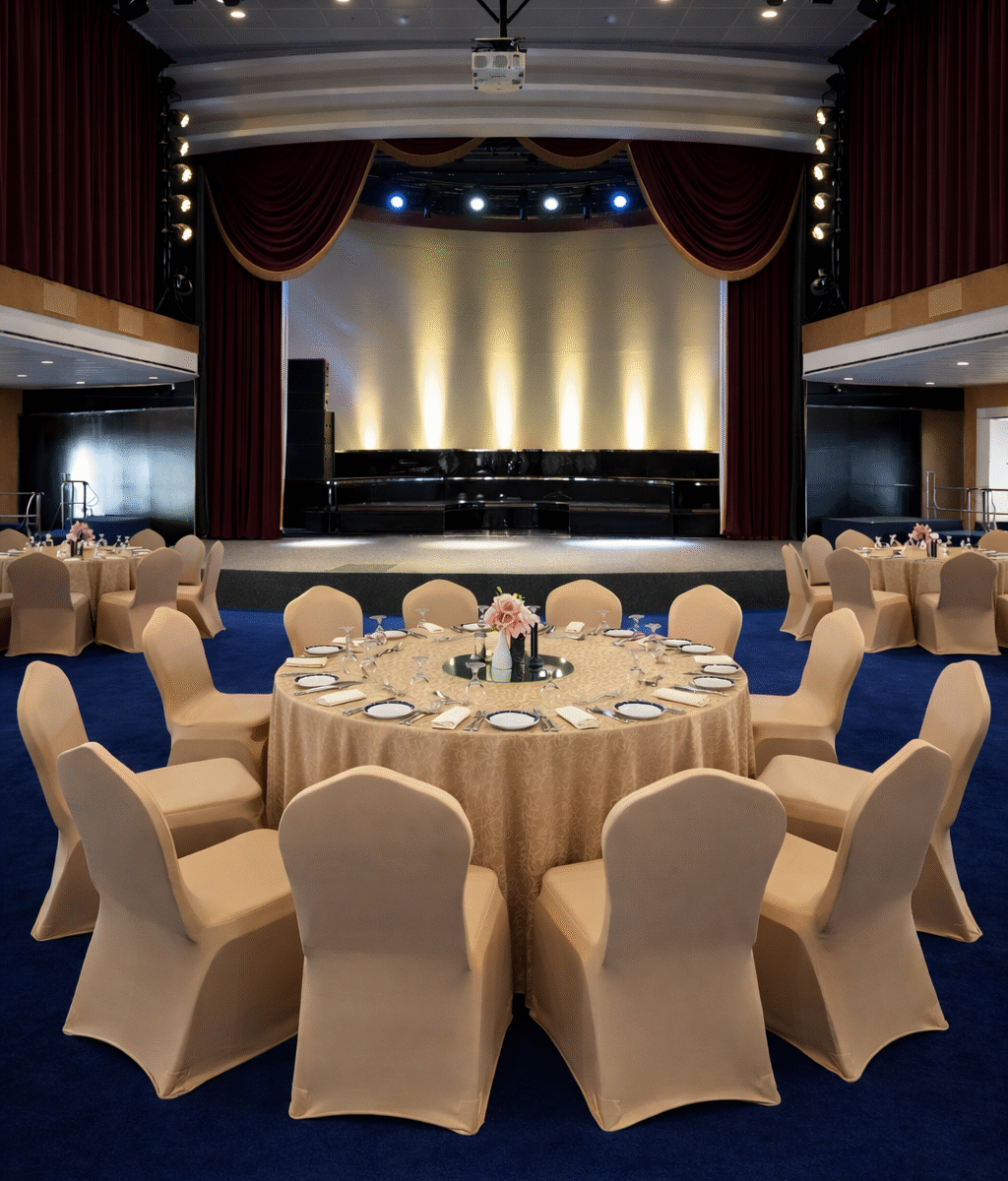 Exuding the glitz and glamour of a bygone era, The Grand Lounge at Queen Elizabeth 2 in Dubai is a cabaret-style venue and event space with a grand stage perfect for evening entertainment.