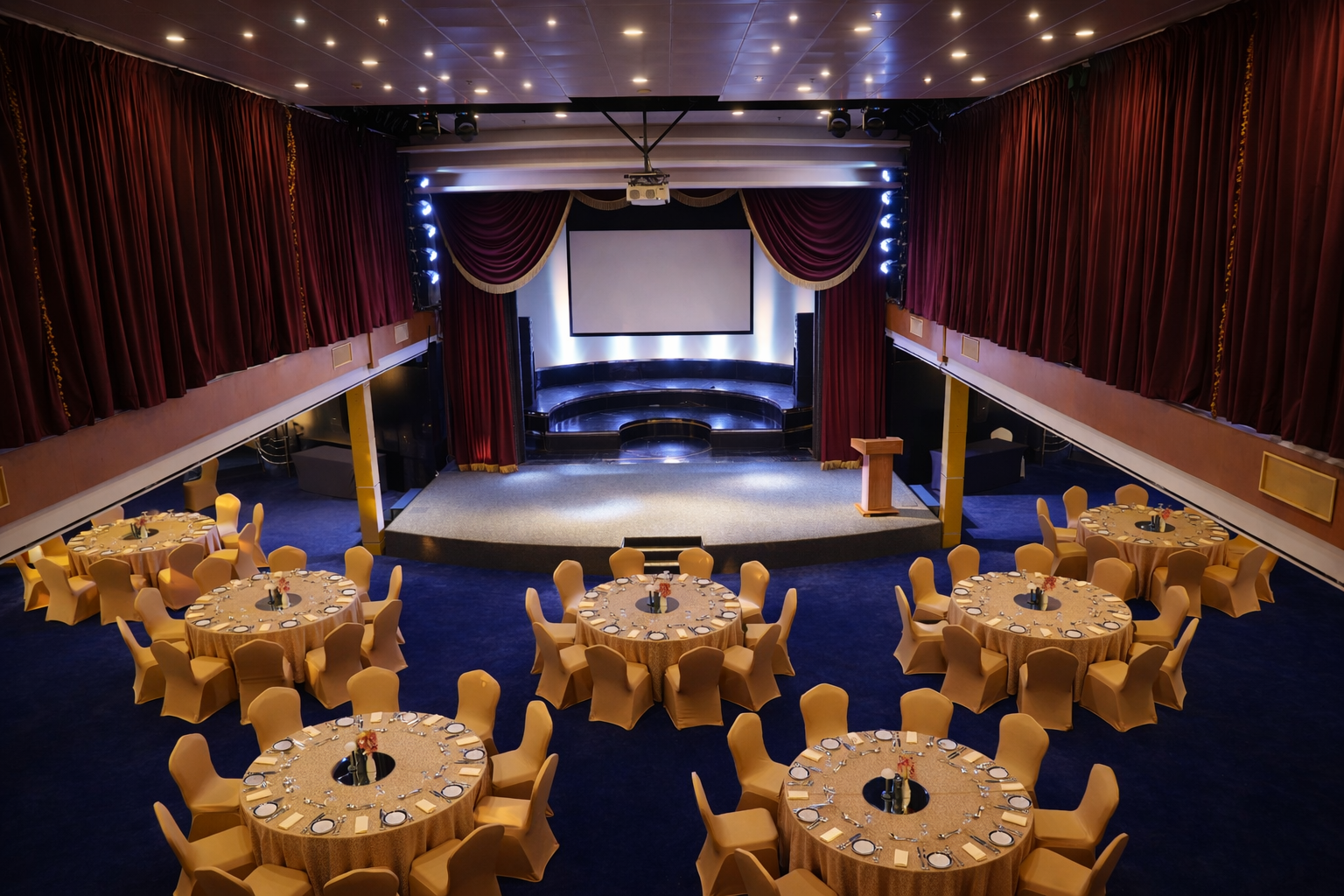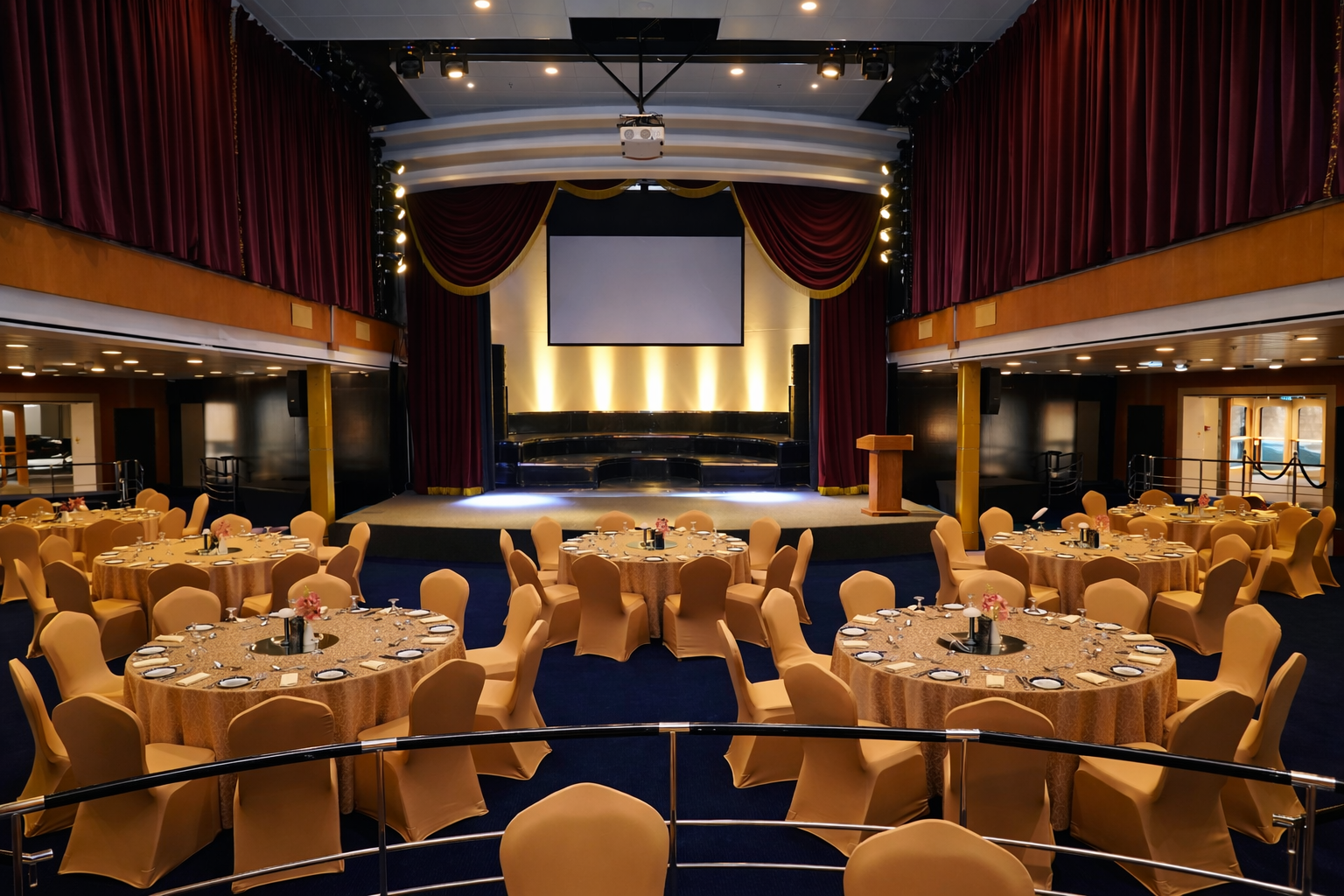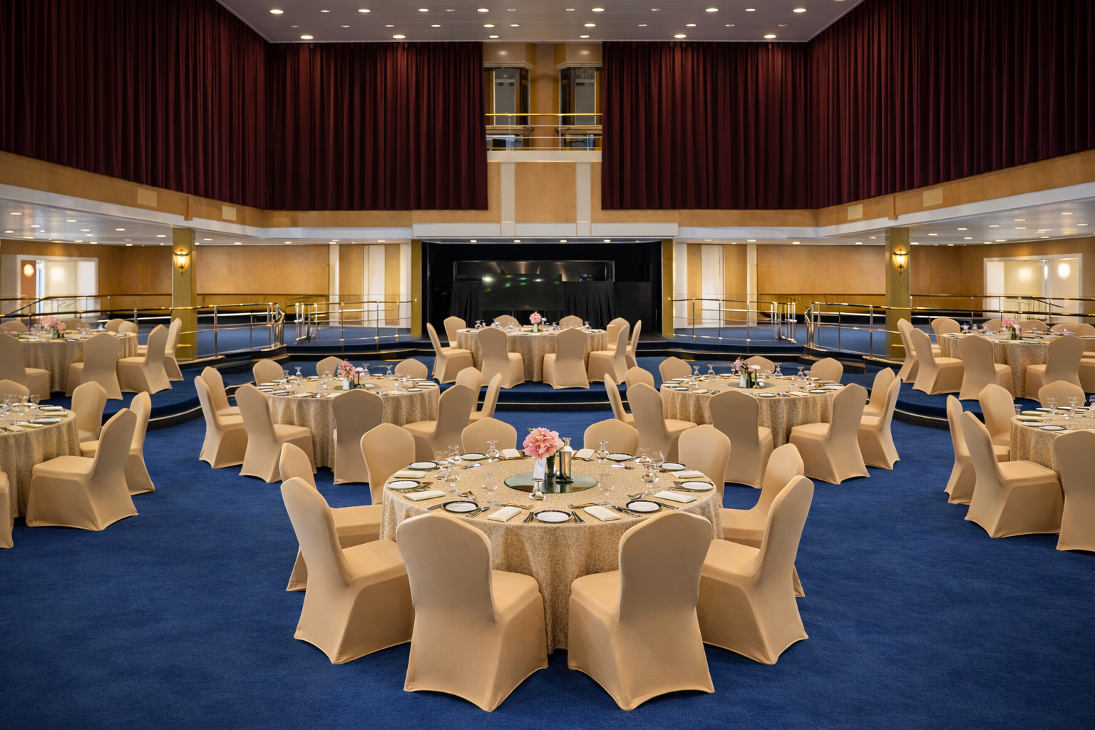 Exuding the glitz and glamour of a bygone era, The Grand Lounge at Queen Elizabeth 2 in Dubai is a cabaret-style venue and event space with a grand stage perfect for evening entertainment.