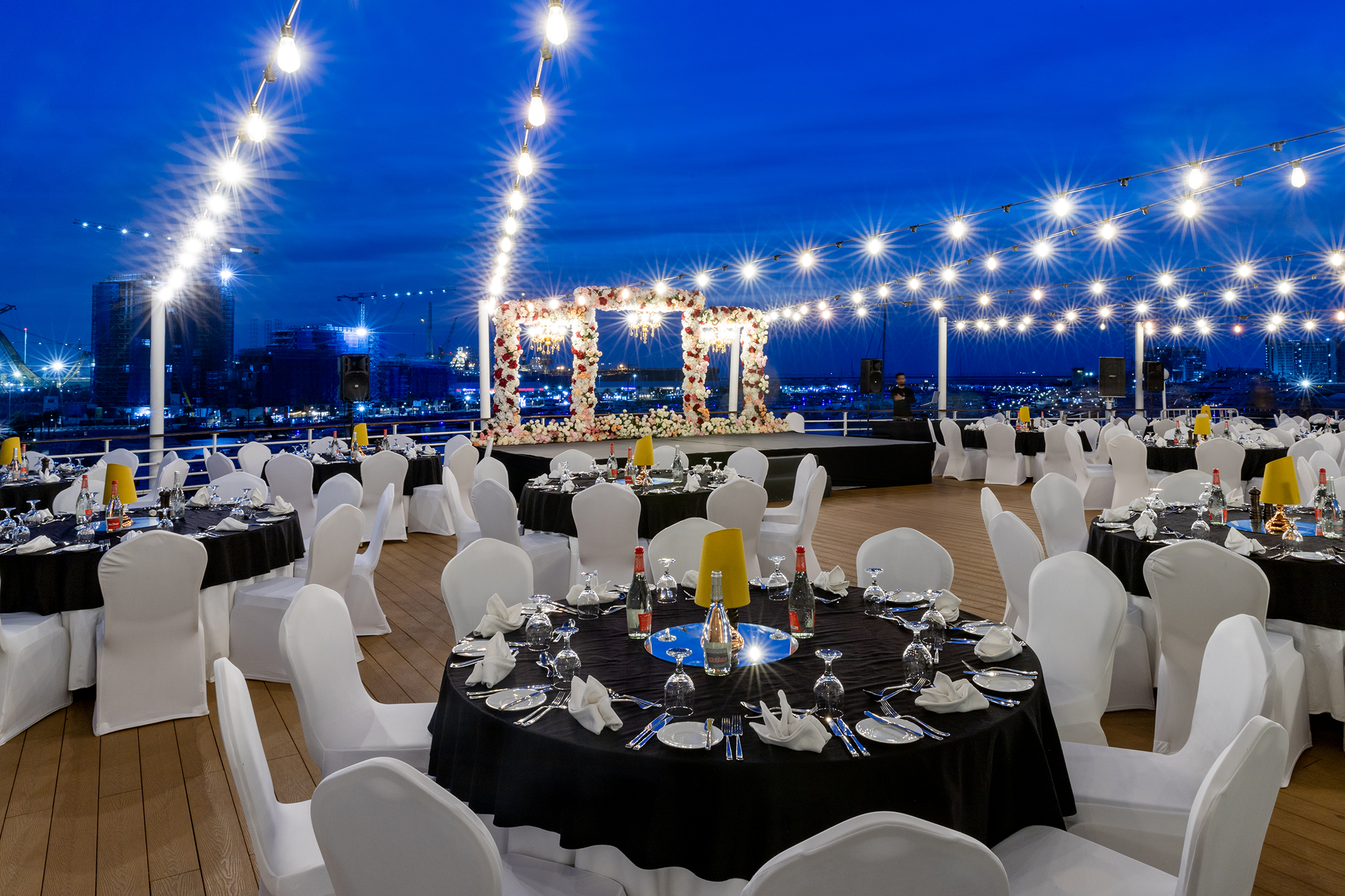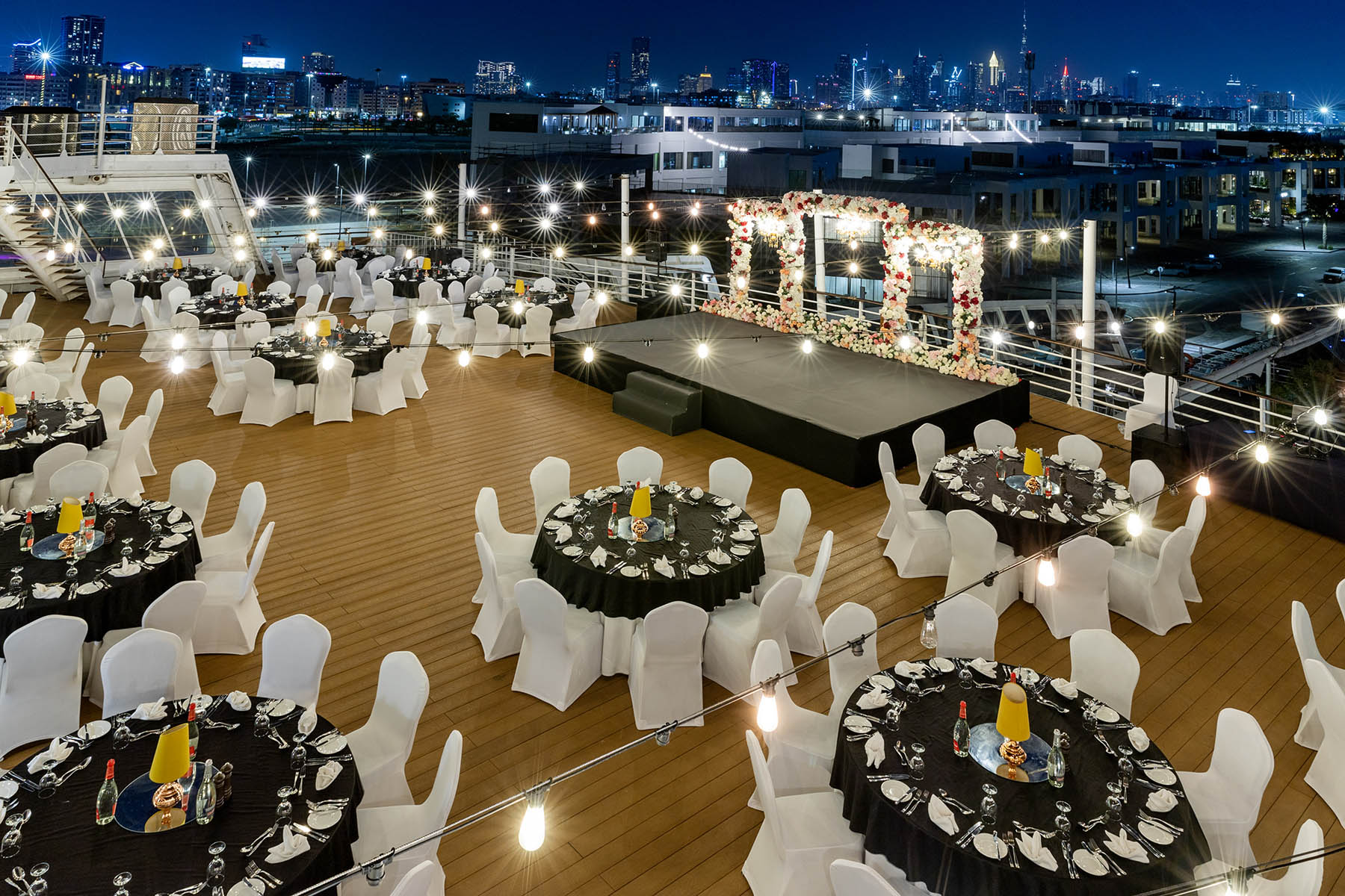 Beautifully decorated to your liking, our Yacht Club Deck is a stunning wedding venue in the heart of Dubai that offers a journey through time that will be a testament to your true love. From intimate celebrations to larger wedding receptions, our deck venue at QE2 promises a space special enough to match any occasion.