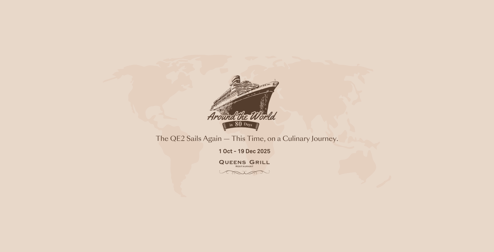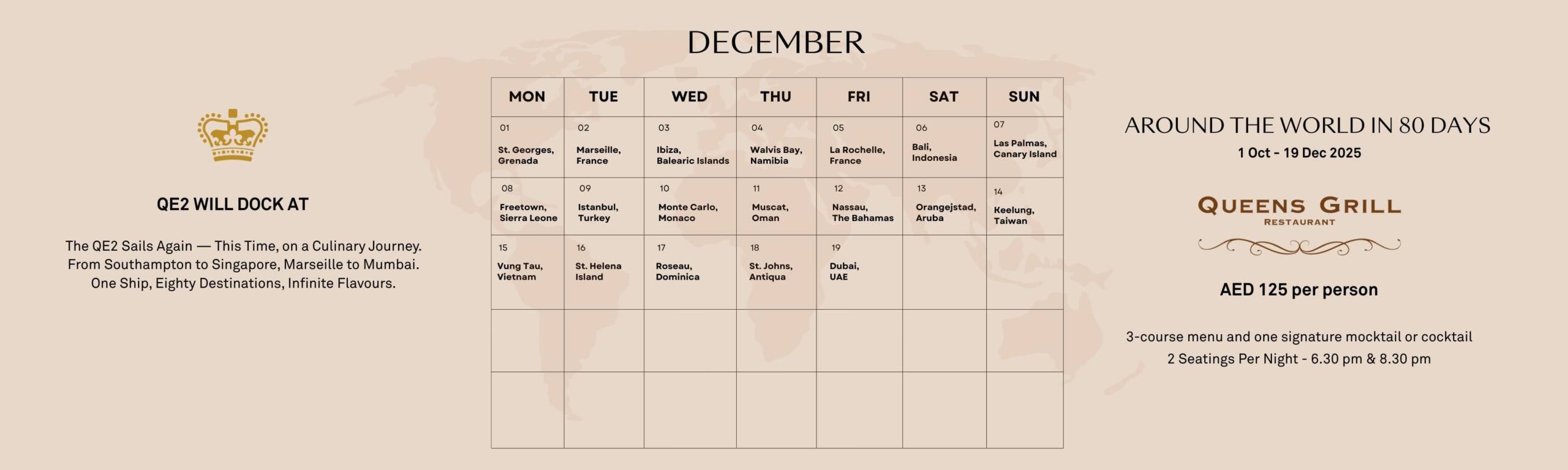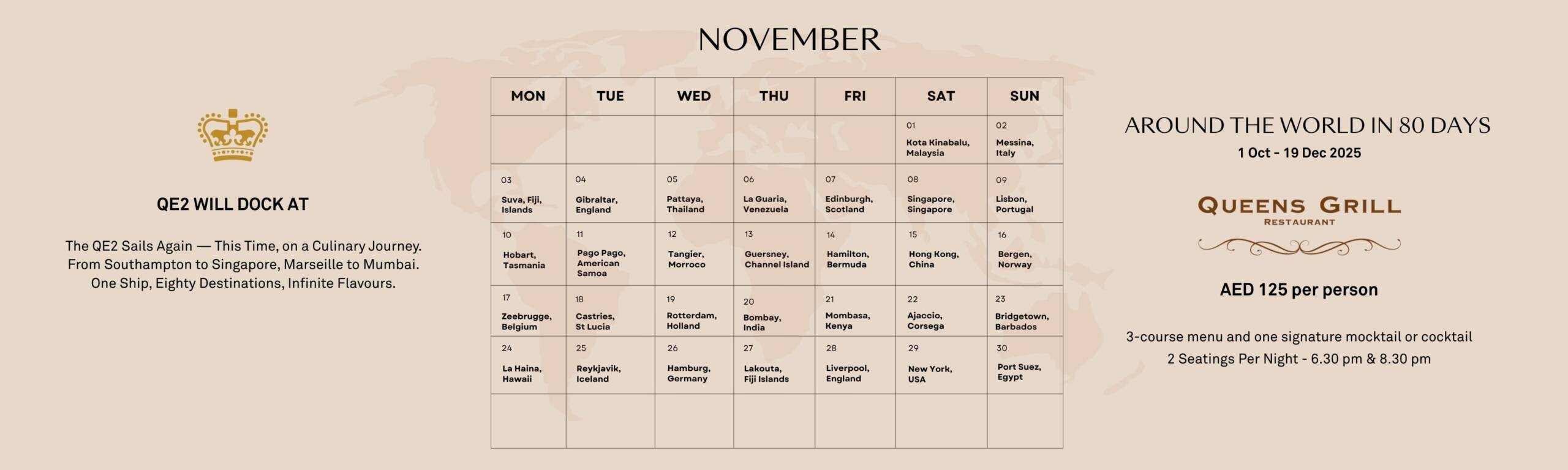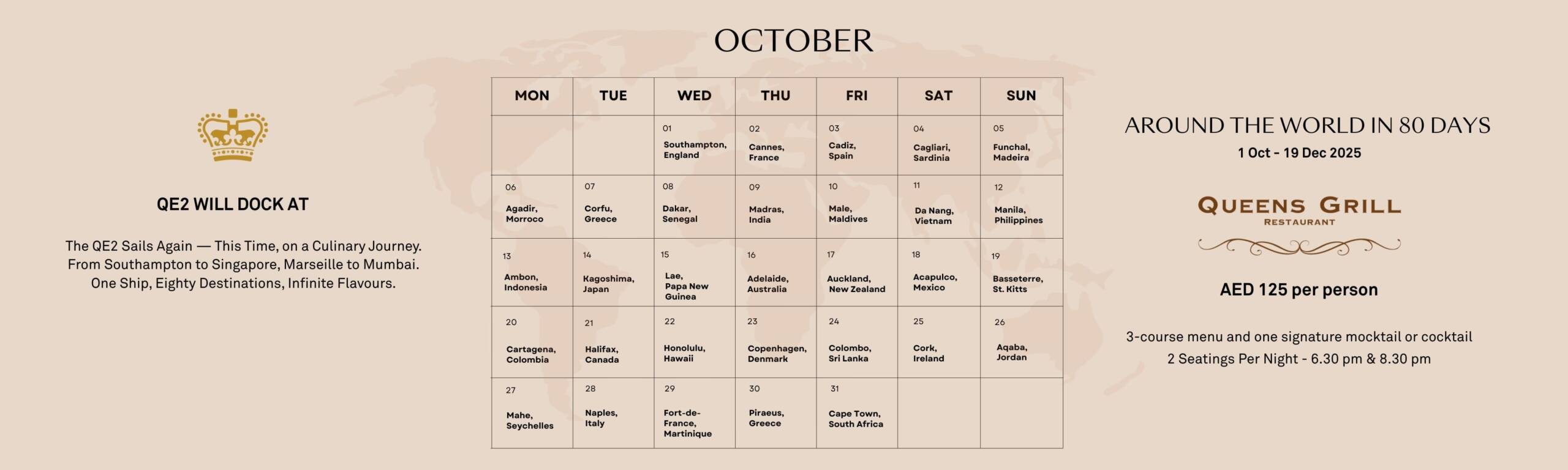 The legendary Queen Elizabeth 2 invites you to embark on an extraordinary 80-night dining odyssey in the historic Queens Grill, once reserved for first-class passengers. Each evening from October 1 to December 19, 2025, guests aboard our floating hotel will enjoy a curated three-course menu, inspired by the culture, cuisine, and memory of a different port visited during the QE2’s golden years at sea.