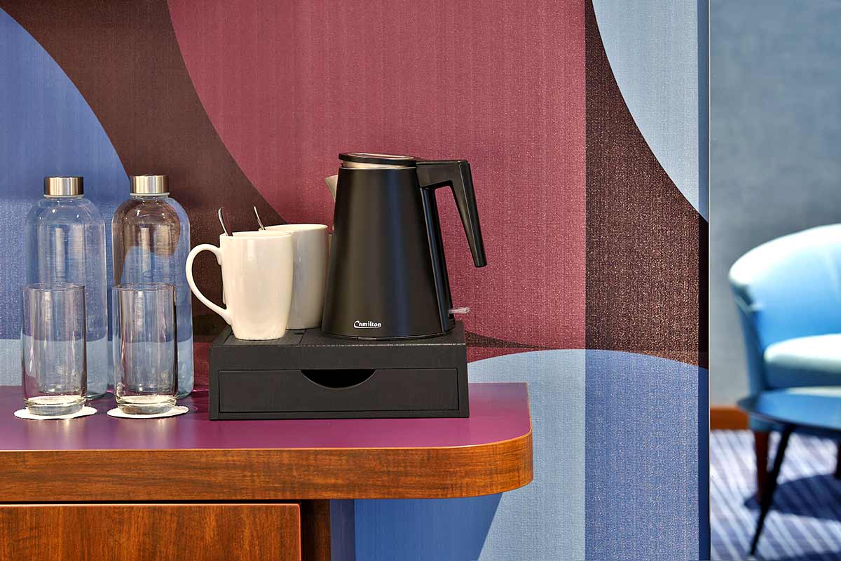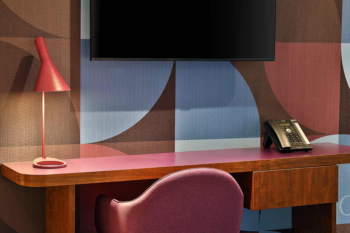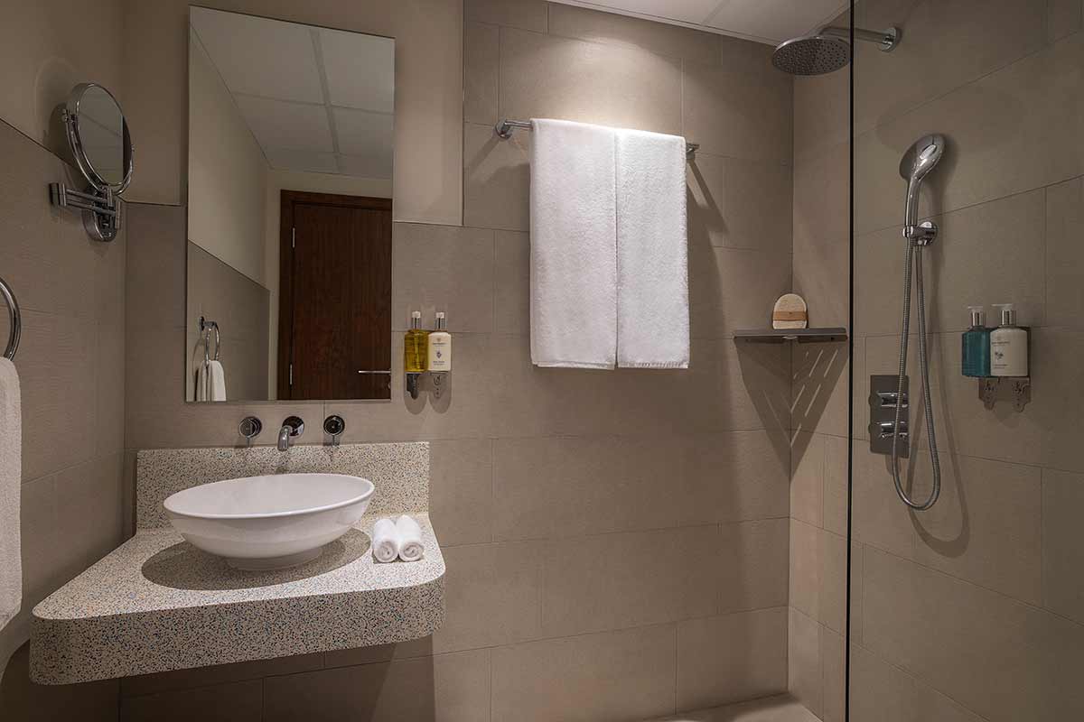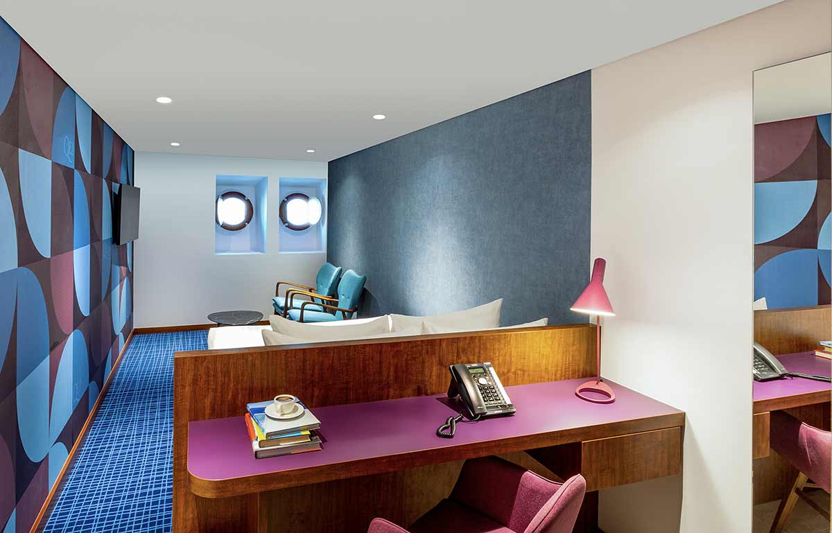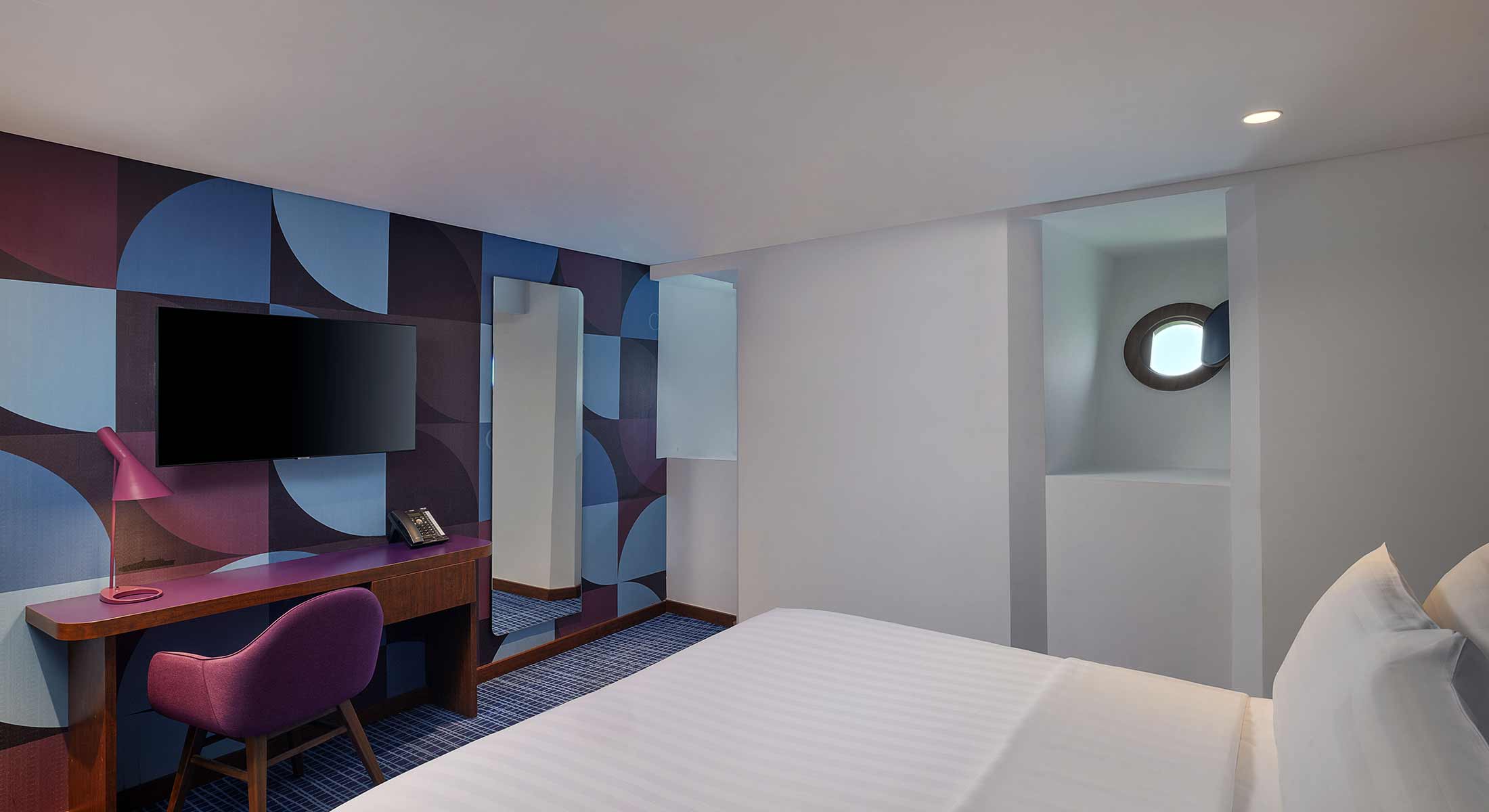 The well-appointed hotel rooms offer an authentic cruise-ship cabin experience, with original porthole windows providing city views of the iconic Dubai skyline.