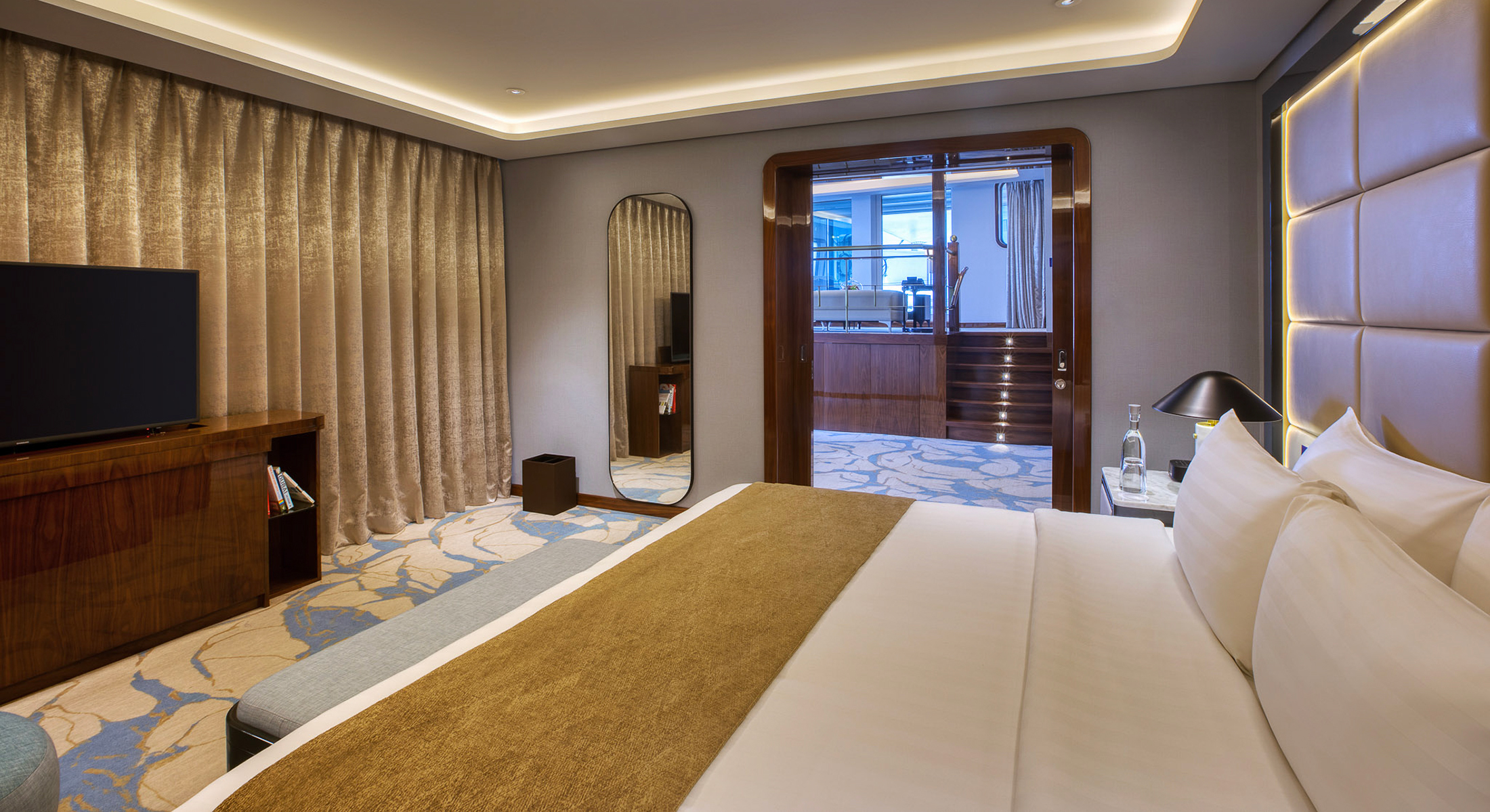 Enjoy the spacious and comfortable bedroom with classic maritime design for an unforgettably unique hotel stay at sea. The bathroom is a sanctuary in itself; a lavish space lined with marble and equipped with premium amenities. It features a deep soaking tub, a glass-enclosed rain shower, and a large vanity with a walkin closet, ensuring a spa-like experience as you prepare for the day or unwind in the evening.