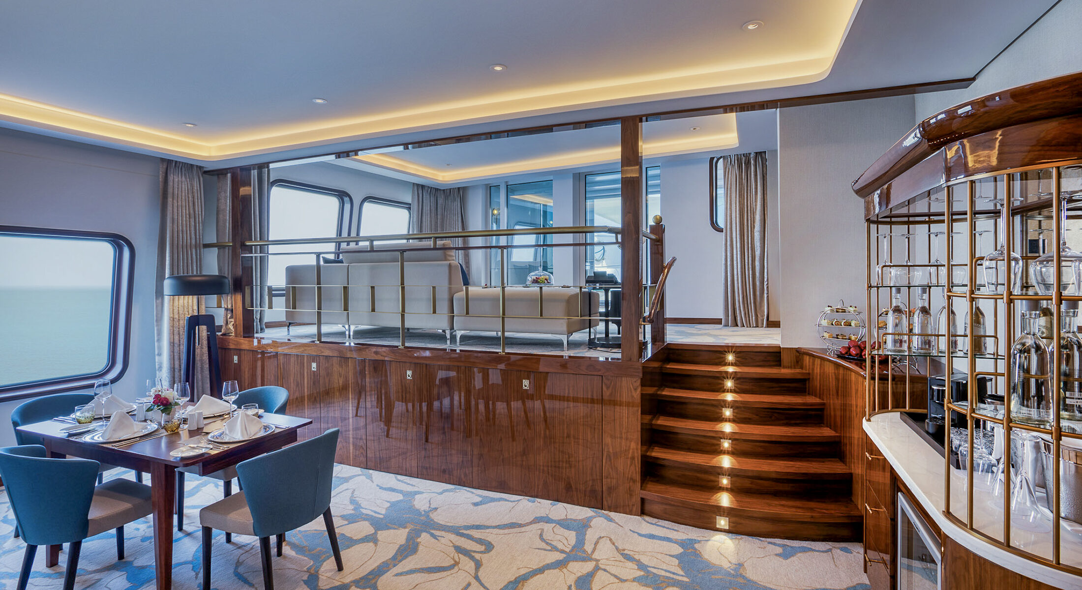 Whether you’re sitting back on the relaxing sofas or enjoying a meal at the elegant dining table, every moment is framed by the sea’s majestic beauty visible through the rooms large windows.